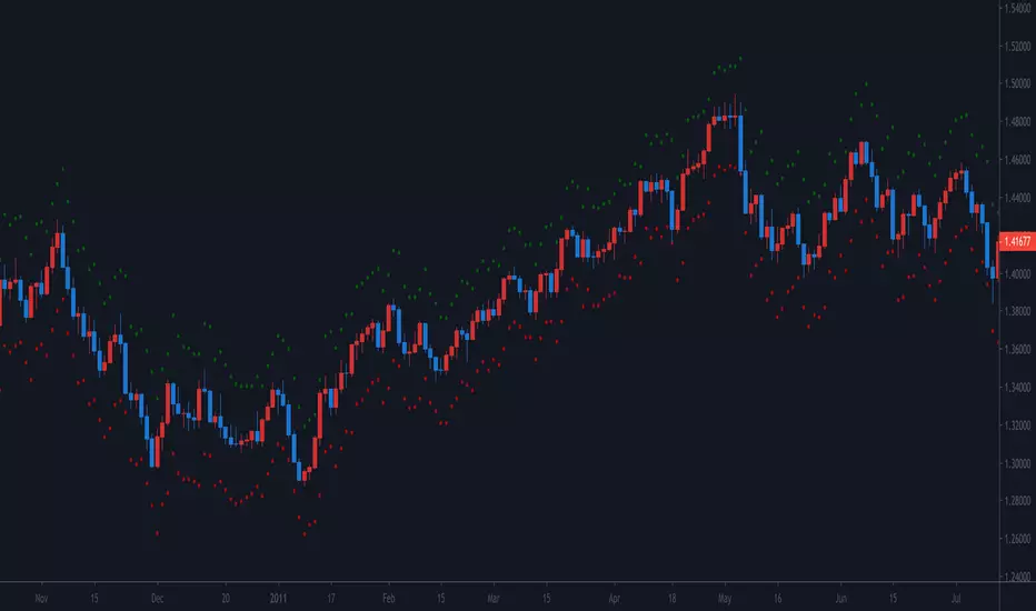 Places a dot some ATRs away from candle close - useful for stop placement.