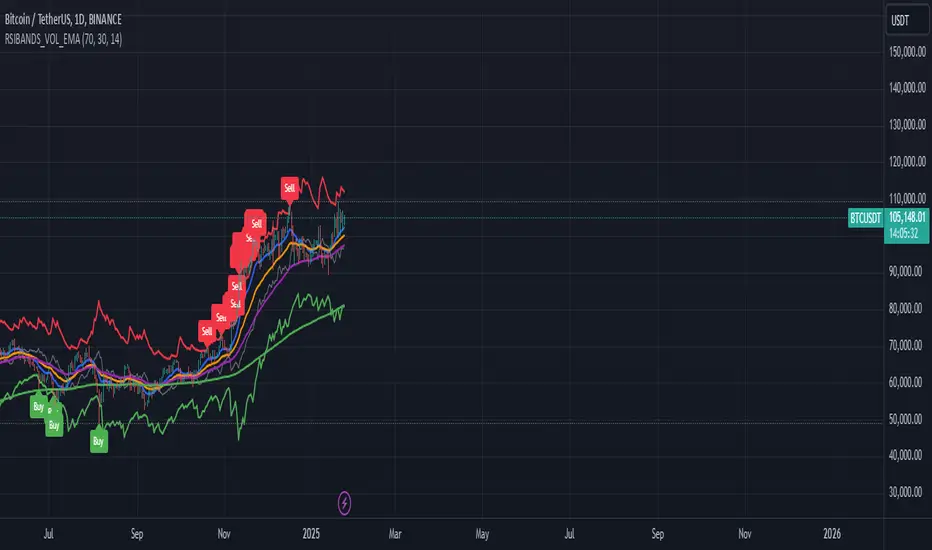 This script is a comprehensive technical analysis tool designed to assist traders in identifying key market signals using RSI Bands, Volume, and multiple Exponential Moving Averages (EMAs). It overlays the following indicators on the chart:1. RSI Bands: