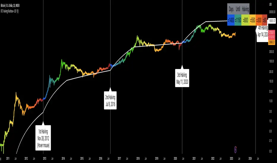 This script creates a colorful view of Bitcoin's price action, where different colors indicate the time until the next halving date. The color scale in the top right highlights what each main color group represents in terms of days until the next halving. Using historical data, the simple indication of days until the next halving has somewhat accurately predicted potential bottoms and tops of market cycles. Comparing current colors to previous cycles provides a rough view of where BTC is in its current cycle and what to expect going forward until the next halving date.