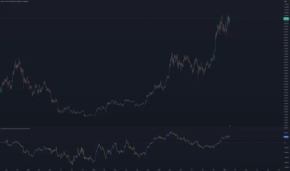 Logic: If open dominance is greater, it accumulates open volume based on price movement; if close dominance is greater, it accumulates close volume.