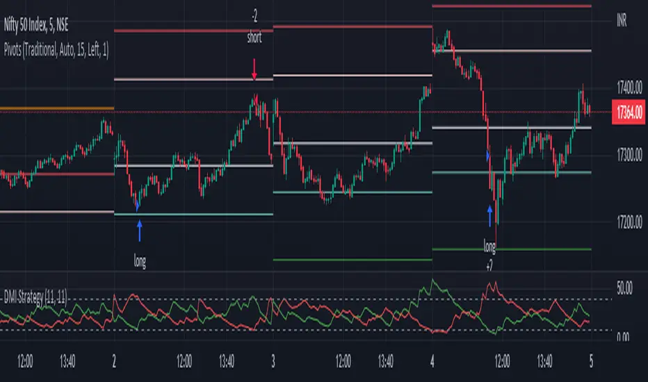 This strategy is based on DMI indicator. It helps me to identify base or top of the script. I mostly use this script to trade in Nifty bank options, even when the signal comes in nifty . It can be used to trade in other scripts as well. Pivot points can also be used to take entry. Long entry is taken when DI+(11) goes below 10 and DI-(11) goes above 40 , whereas short entry is taken when DI-(11) goes below 10 and DI+(11) goes above 40.