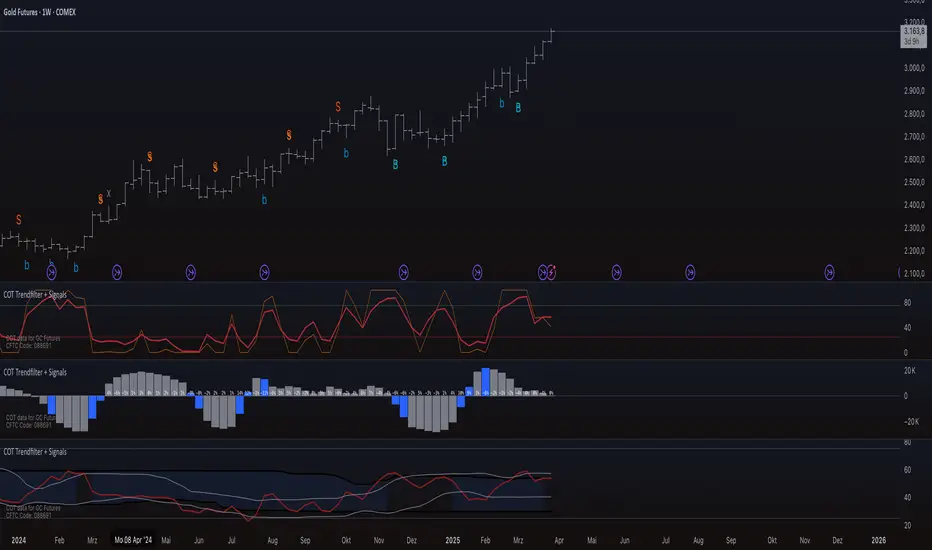 Data Processing and Usage: The COT indicator processes Commitments of Traders (COT) data provided by the CFTC. Users can select from various participant groups, including Commercials, Large Speculators, and Small Speculators. However, it is important to note that the signal logic of the indicator is exclusively applicable to the net positions of Commercials. This is because Commercials tend to trade contrarily, meaning their trading decisions often run against the prevailing market trend.