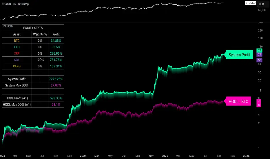 The Uptrick: Relative Strength Rotation System is a rotation engine that leverages a proprietary scoring matrix to simulate tactical asset allocation. It analyzes inter-asset behavior through pairwise ratio metrics and statistically normalized scoring methods, enabling it to identify leadership dynamics within a defined universe. The inclusion of PAXG as a defensive fallback, regime-aware cash filtering, and customizable rebalancing cadence gives the system adaptability beyond traditional relative strength models. Users are provided with transparent visual feedback through an equity curve, contextual labels, buy-and-hold overlays, and real-time equity statistics. The system is not designed to disclose its internal mechanics, but it enables full visualization of its output and decisions for comparative analysis.