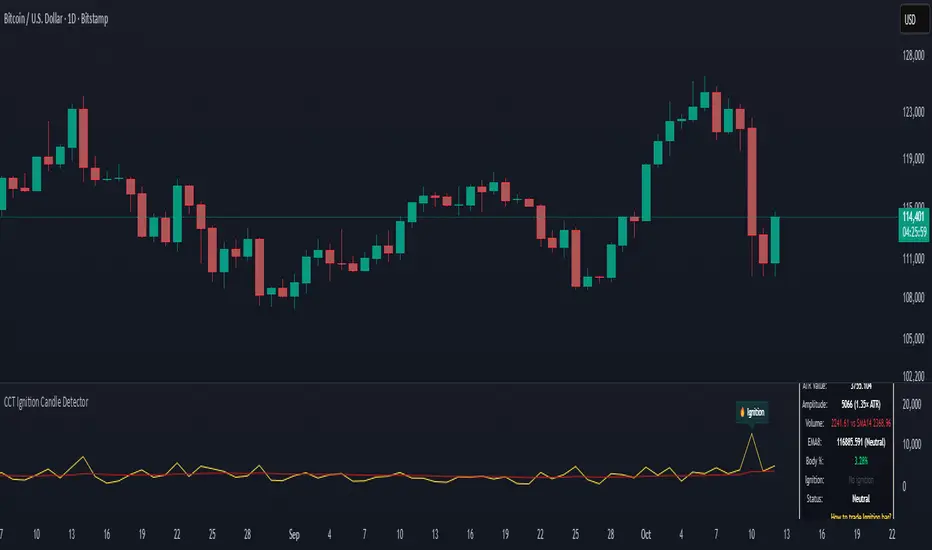 The CCT Ignition Candle Detector indicator was developed to assist traders in identifying “ignition candles” — candles that represent potential high-volatility breakout events accompanied by strong volume and a clear directional move relative to short-term trend averages.