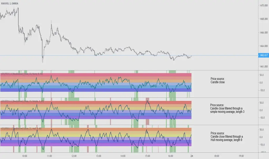Version 2.1- Added a moving average filter to price source. Its usage is mainly for lower timeframes where VZO jitters too much to be useful.