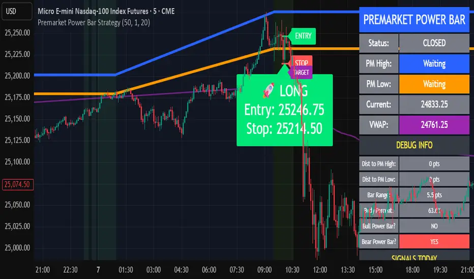 A power bar is a large-bodied candle with strong momentum and little to no wick on the opposite side. It should form directly at the premarket level—not near it, not after a breakout.