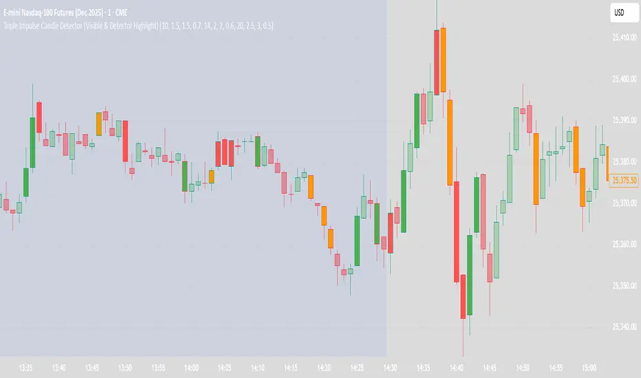 Triple impulse candle detector system. Indicator uses size multiplier, volume multiplier and body to mick ratio, to calculate the size of its impulse