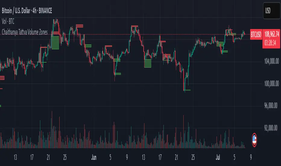 Chaitanya Tattva Volume Zones identifies exceptional volume spikes within the recent price history and visually marks the areas where market intent has been most active.