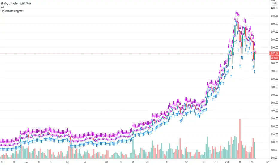 When you develop your own strategy you should compare its performance to the "buy-and-hold" strategy (you buy the financial instrument and you hold it long term). Ideally your strategy should perform better than the buy-and-hold strategy. While the net profit % of the buy-and-hold strategy is available under the "Performance Summary" tab of the "Strategy Tester" there are other factors that should be considered though. This is where this strategy comes in. It mimics the buy-and-hold strategy and gives you all the stats that are available for any strategy. For example, one such criteria that should be considered is the max. drawdown. Even if you strategy performs worse than the buy-and-hold strategy in terms of net profit, if the max. drawdown of your strategy is considerably lower than that of the buy-and-hold it may overall be a better strategy than the buy-and-hold as, in this scenario, it likely exposes the investor to significantly less risk.