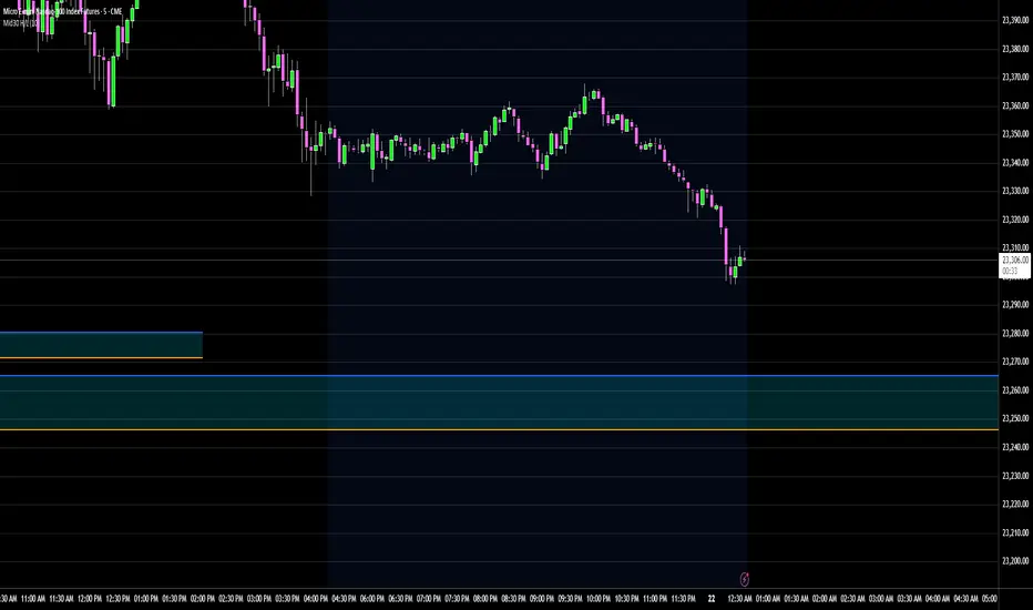 This indicator captures the high and low prices during the critical 30-minute midnight session (12:00-12:30 AM EST) and projects these levels forward as key support and resistance zones. These overnight ranges often contain significant liquidity and serve as crucial reference points for intraday price action, representing areas where institutional activity may have established important levels.