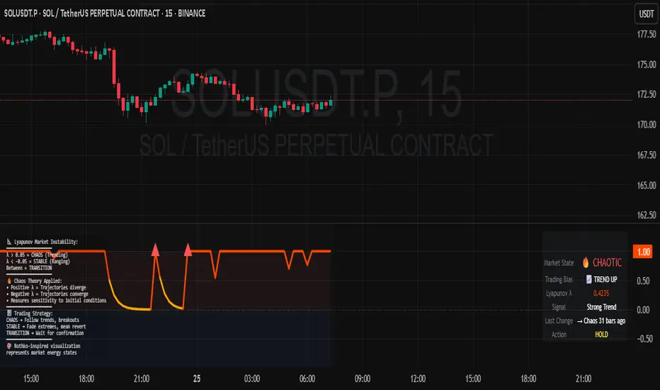 Note: After completing this indicator, I discovered loxx's 2022 "Lyapunov Hodrick-Prescott Oscillator w/ DSL". While both explore Lyapunov exponents, they represent independent implementations with different methodologies and applications. This indicator uses phase space reconstruction for regime detection, while his combines Lyapunov concepts with HP filtering.