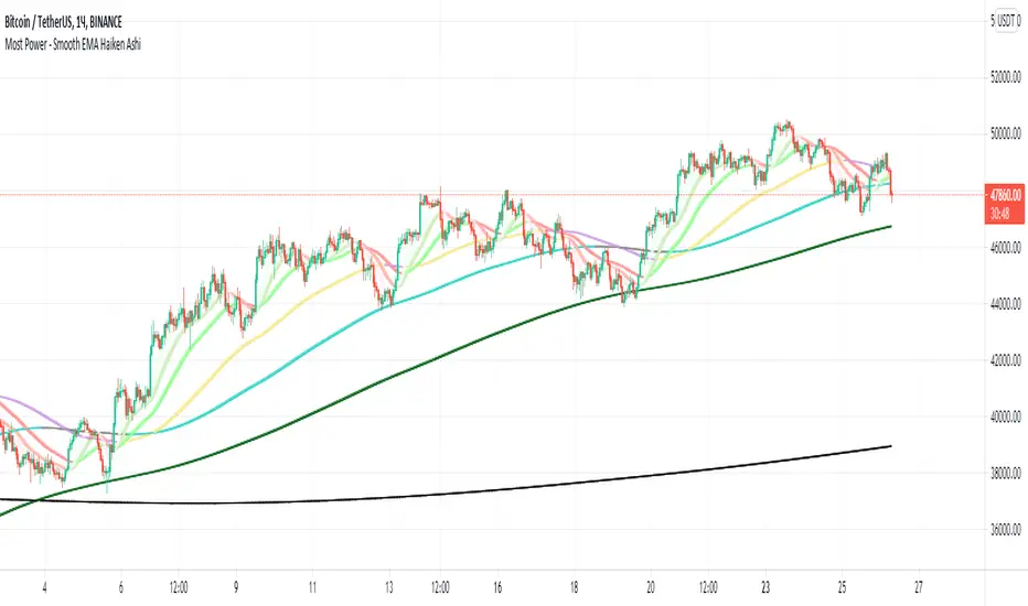 The indicator displays smoothed EMA (5, 10, 20, 50, 100, 200, 1000). Smoothing occurs through the use of Haiken AShi