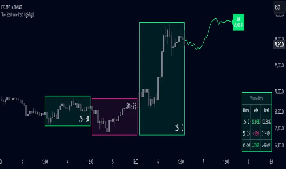 Three Step Future-Trend by BigBeluga is a forward-looking trend analysis tool designed to project potential future price direction based on historical periods. This indicator aggregates data from three consecutive periods, using price averages and delta volume analysis to forecast trend movement and visualize it on the chart with a projected trend line and volume metrics.