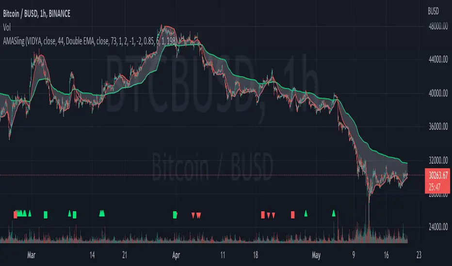This indicator modifies the SlingShot System by Chris Moody to allow it to be based on 'any' Fast and Slow moving average pair. Open Long / Close Long / Open Short / Close Short alerts can be generated for automated bot trading based on the SlingShot strategy: