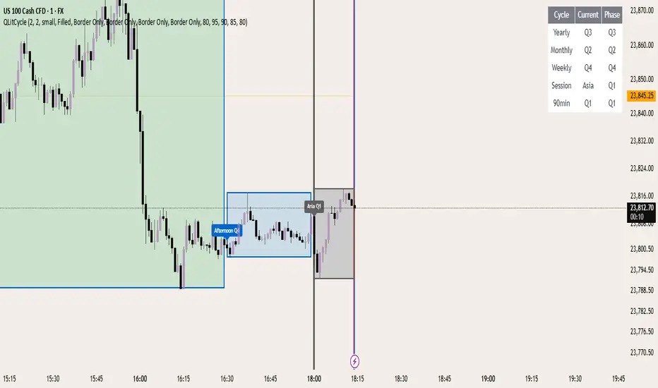 QLitCycle is an intraday cycle visualization tool that divides each trading day into multiple segments, helping traders identify time-based patterns and recurring market behaviors. By splitting the day into distinct periods, this indicator allows for better analysis of intraday rhythms, cycle alignment, and time-specific market tendencies.
