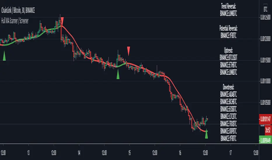 This screens for Hull MA trend reversal's in 10 different securities. If the label color is not visible due to the text in it being white colored, then choose a different color from settings. Also added a simple HullMA to it. If want can increase it upto 40 securities in the code which is upto user to decide.