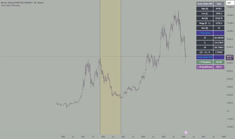 This indicator calculates a theoretically derived PBR (Points Per Bar) scaling value based on the concept of √price space geometry. You select a swing high and low using date inputs, and it outputs PBR values that can be used with TradingView's chart scaling for experimental geometric analysis with circle and arc tools.