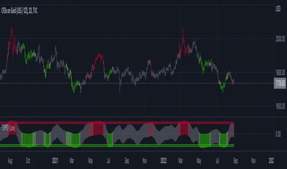 T3 PPO [Loxx] is a percentage price oscillator indicator using T3 moving average. This indicator is used to spot reversals. Dark red is upward price exhaustion, dark green is downward price exhaustion.