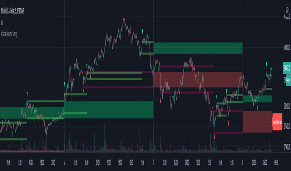 This script tracks volume swings over an intraday chart and stores the final lowest low swing / highest high swing over the course of the day. The final high swing and low swing are then plotted over the following day as possible retracement / support & resistance levels.