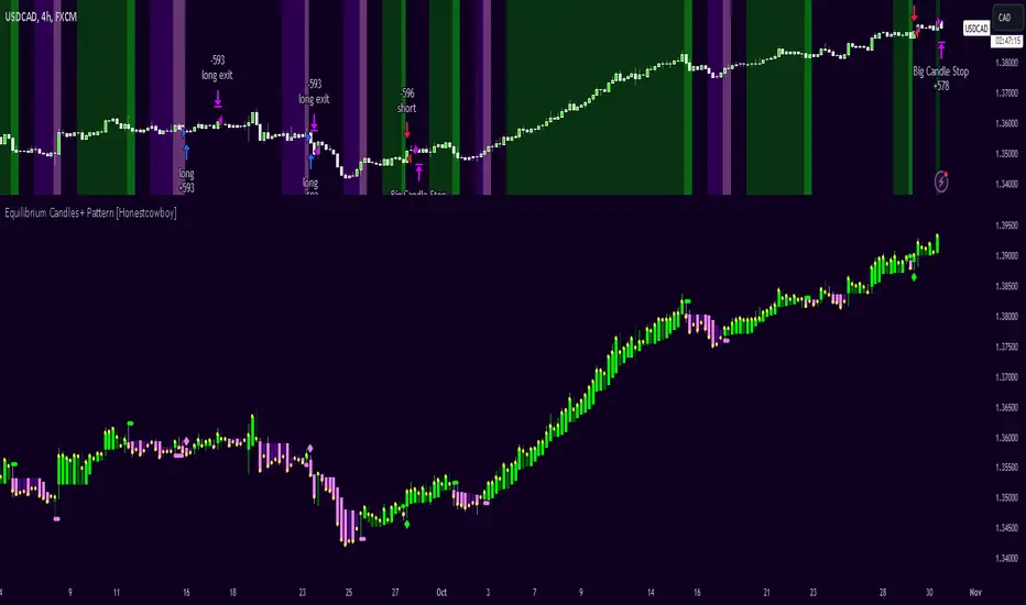 The equilibrium is calculated the same as Baseline in Ichimoku Cloud. Which provides a point where price is very likely to retrace to. This script visualises the distance between close and equilibrium using candles. To provide a clear visual of how price relates to this equilibrium point.