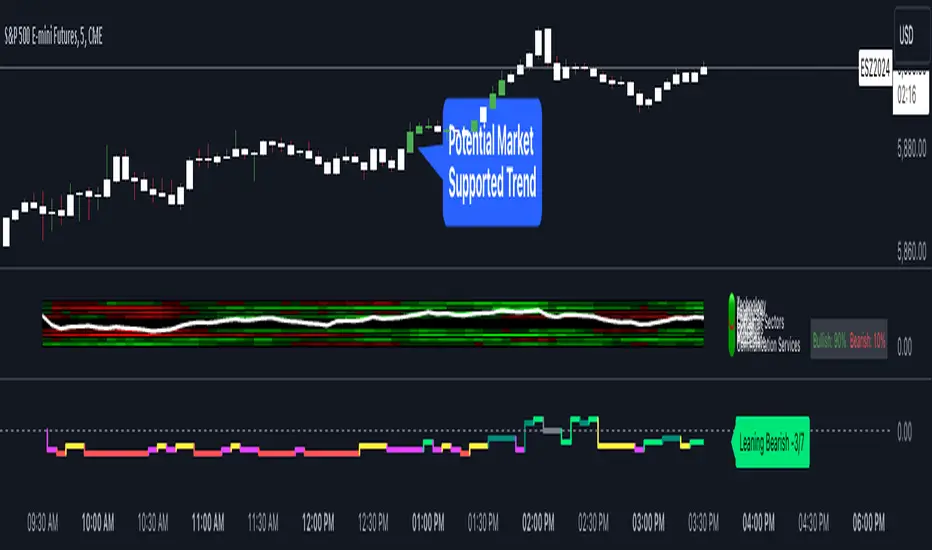 This indicator plots a visual heatmap showing the sentiment strength for each sector on a scale from 0 to 100. The colors range from green for bullish sentiment to red for bearish sentiment. Additionally, it displays a real-time percentage of sectors that are bullish and bearish in a dynamic table located in the bottom right corner of the chart.