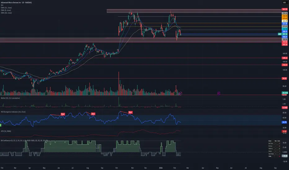 Think of the score as a quick summary, not a signal. A score above +60 means EMA, RSI, VWAP, volume, and price structure are mostly pointing the same direction — that's useful context if you're considering a long entry. A score near zero means signals are contradictory, which is a reason to wait.