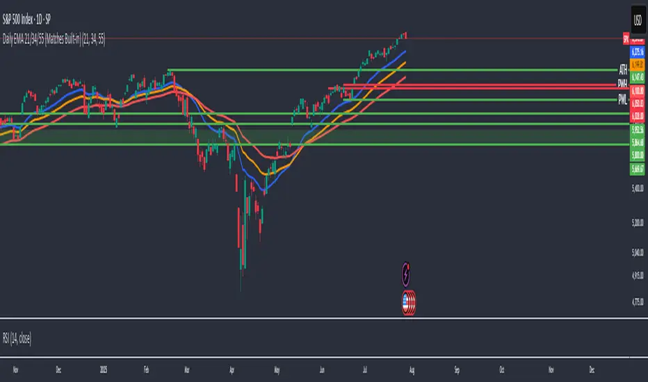 The EMAs and color coding can be changed, by default it contains 21/34/50 on Daily, The script can be edited to suit the timeframe whichever wanted