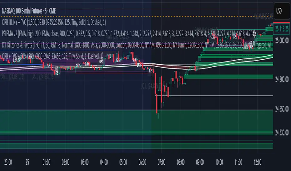 A complete smart-money–focused price-action toolkit combining the New York Open Range Breakout (ORB), ICT-style Fair Value Gaps, Inverted FVGs, and a dynamic Daily 50% Midline.