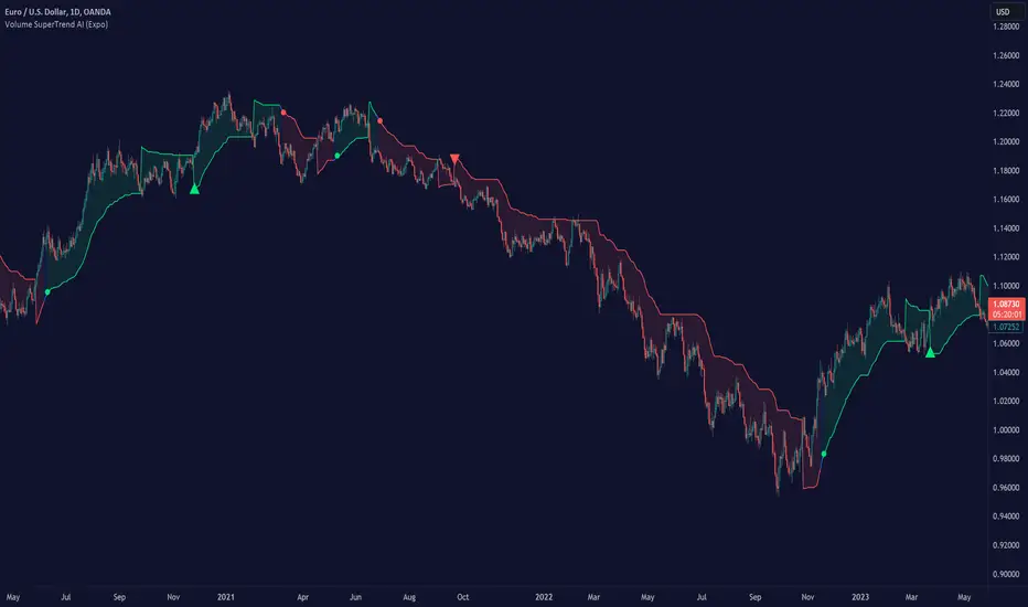 Volume Analysis: By utilizing volume-weighted moving averages (VWMA), the Volume SuperTrend AI emphasizes the importance of trading volume in the trend direction, allowing it to respond more accurately to market dynamics.