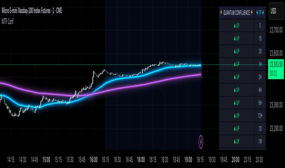 The MTF Confluence Dashboard is a fast, non‑repainting multi‑timeframe (MTF) confluence tool that shows higher‑timeframe trend and bias alignment in a compact, on‑chart table. It’s built for prop‑firm challenges and futures day traders who need instant top‑down confirmation without switching charts. Get a clean read of trend direction across your selected timeframes, plus on‑chart MAs for timing.