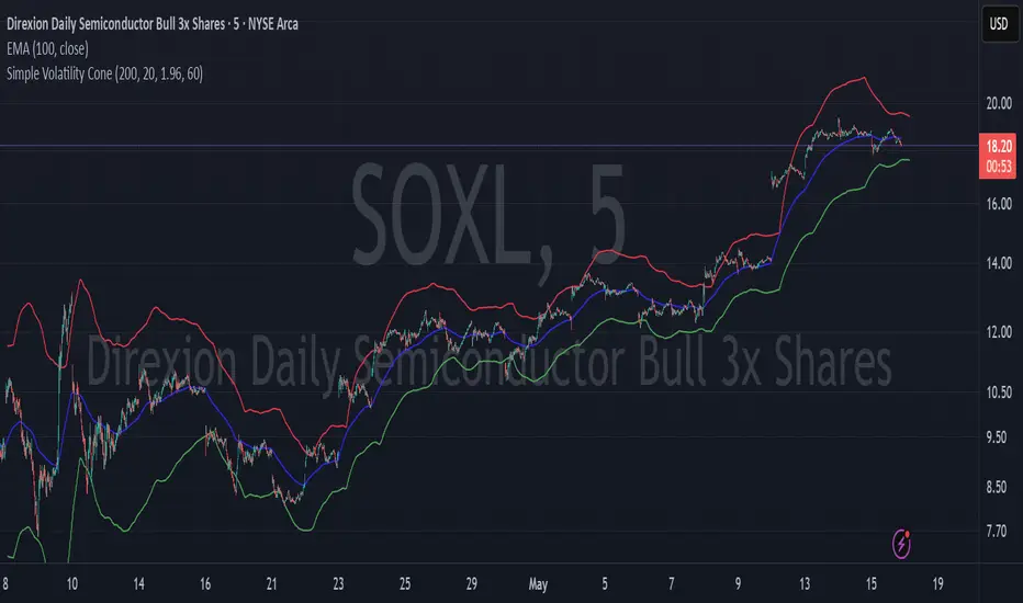 The Simple Volatility Cone indicator projects the potential future price range of a stock based on recent volatility. It calculates rolling standard deviation from log returns over a defined window, then uses a confidence interval to estimate the upper and lower bounds the price could reach over a future time horizon. These bounds are plotted directly on the chart, offset into the future, allowing traders to visualize expected price dispersion under a geometric Brownian motion assumption. This tool is useful for risk management, trade planning, and visualizing the potential impact of volatility.