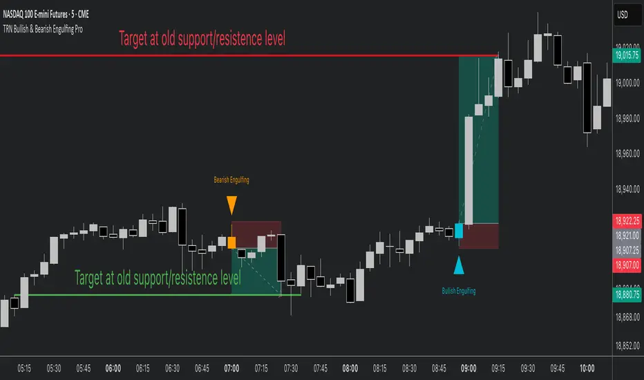 Bullish and Bearish Engulfing patterns are displayed with distinct, customizable colors and labels for instant recognition. - Flexible customization: