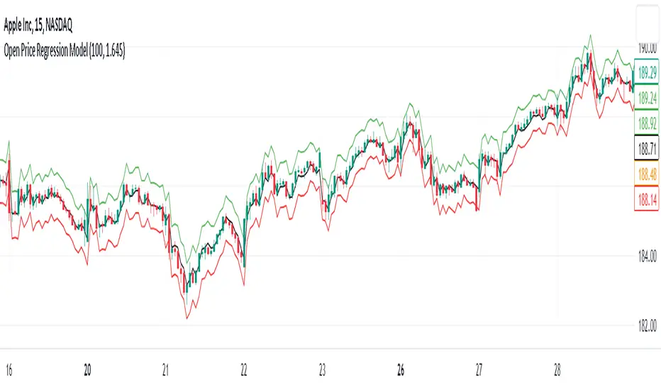 The Open Price Regression Model aims to predict future high, low, and close prices based on the current open price. Traders can use the predicted values and confidence intervals as potential price targets and volatility measures. Traders can consider taking long or short positions based on whether the current open price is below or above the predicted prices. Can be used on a daily time frame to forecast the day's high and low and use this levels are horizontal price levels on lower timeframes.