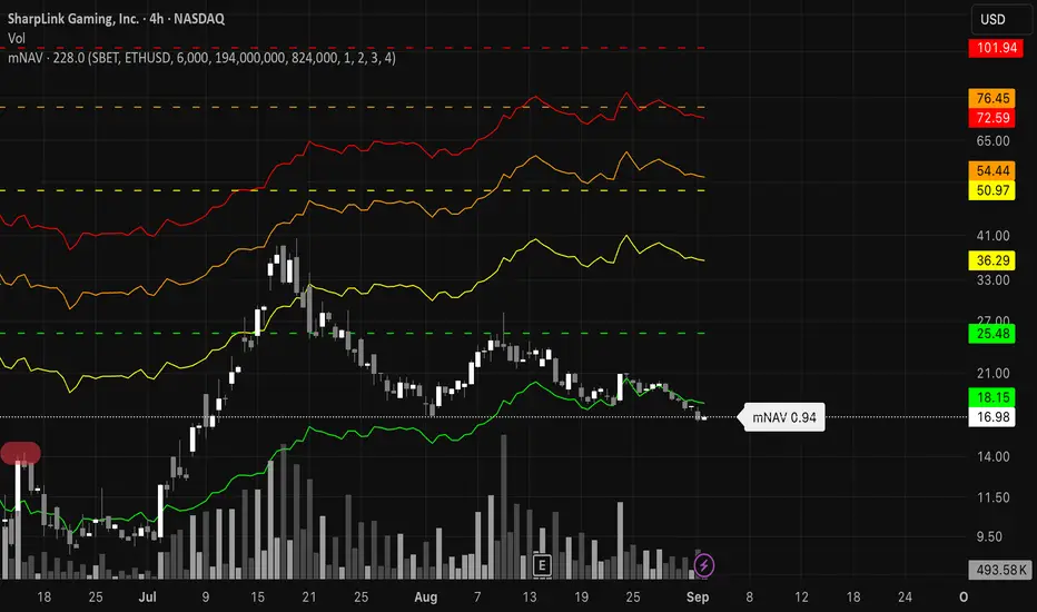 This TradingView indicator calculates and displays the multiple of Net Asset Value (mNAV) for a selected symbol. It uses the asset symbol held, the quantity of assets held, and the number of outstanding shares to compute mNAV per share. The indicator compares the current price to mNAV, showing how many times the asset is trading above or below its mNAV. Users can configure up to four custom mNAV multiples for reference lines, helping to visualize overvaluation or undervaluation relative to mNAV. Ideal for analyzing ETFs, trusts, or crypto funds with transparent holdings.