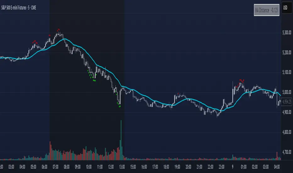 The indicator plots a table in the upper right corner with the % of distance of price from the moving average. It then plots 'mean reversion dots' once price has been 1 or more standard deviations away from the moving average for one or more standard deviations number of bars. The dots change color, becoming more intense, the longer the move persists. Optionally, the user can display the standard deviations in movement away from the moving average as channels, and the user can also select which levels of moves they want to see. Opting to see only more extreme moves will result in fewer signals, but signals that are more likely to imminently result in mean reversion back to the moving average.