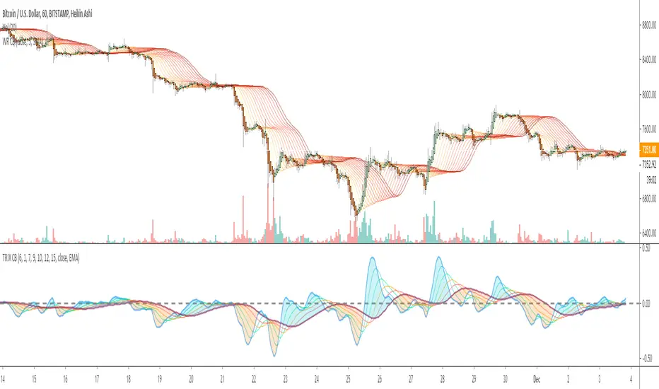 The trix indicator is usually only trix and a signal line. This indicator has 5 signal lines. The TRIX line has the color blue. The first has the color aqua and then lime, orange, red and the last is the maroon line. The first signal line is an EMA of the TRIX line, the second signal line a double smoothed EMA of the trix line and the third is triple smoothed TRIX line and so on.