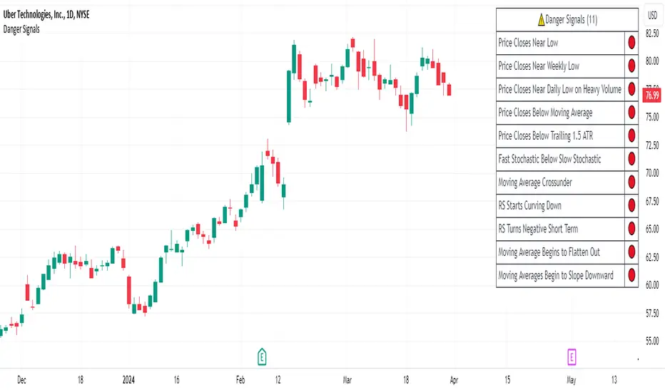 Real-Time Alerts: Identify critical danger signals as they emerge in the market. Whether it's a single day of heightened risk or a pattern forming, stay informed with specific danger signals and a tally of signals for comprehensive decision-making support. The indicator looks for over 30 different signals ranging from simple closing ranges to more complex signals like blow off action.