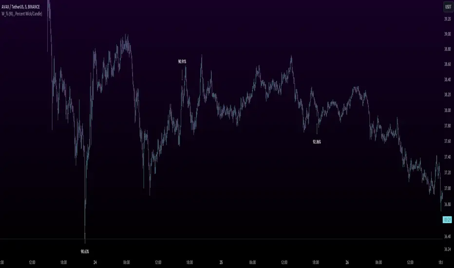 Wick % is a simple indicator to compare wick size with body size (mode 1) and to compare wick size with candle size (mode 2).