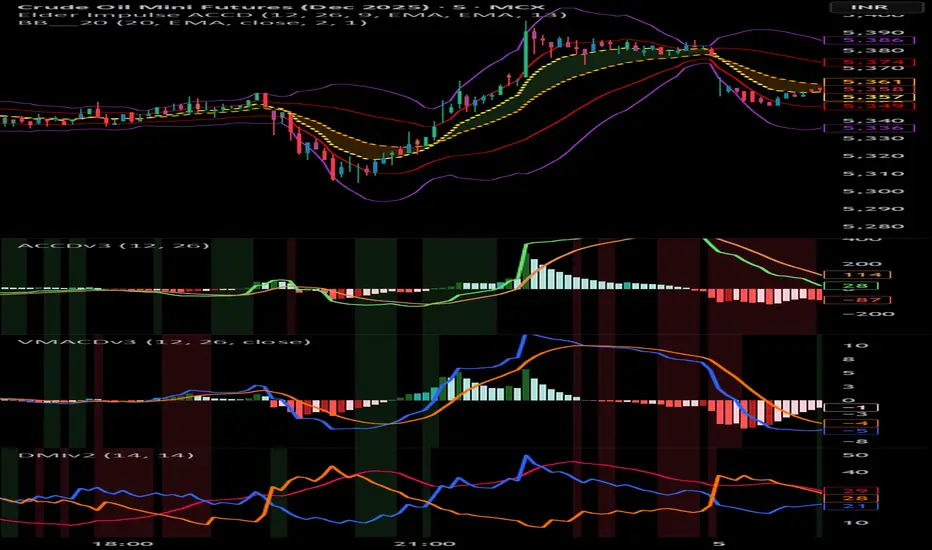 **Use Together**: VMACDv3 (momentum) + ACCDv3 (distribution) + Elder Impulse (bar colors) = complete volume-based trading system