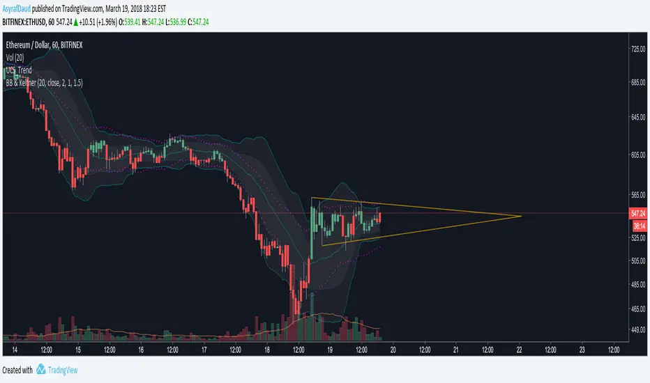 Script that combines 2 Bollinger Bands (Std Dev = 1 and Std Dev = 2) with Keltner Channel (Std Dev = 1.5)