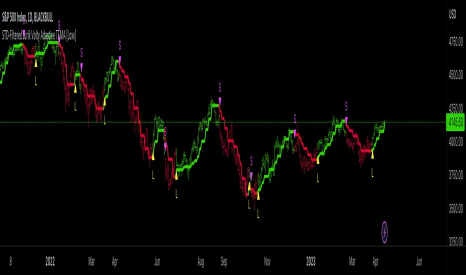 The STD-Filtered Jurik Volty Adaptive TEMA [Loxx] is an advanced moving average overlay indicator that incorporates adaptive period inputs from Jurik Volty into a Triple Exponential Moving Average (TEMA). The resulting value is further refined using a standard deviation filter to minimize noise. This adaptation aims to develop a faster TEMA that leads the standard, non-adaptive TEMA. However, during periods of low volatility, the output may be noisy, so a standard deviation filter is employed to decrease choppiness, yielding a highly responsive TEMA without the noise typically caused by low market volatility.
