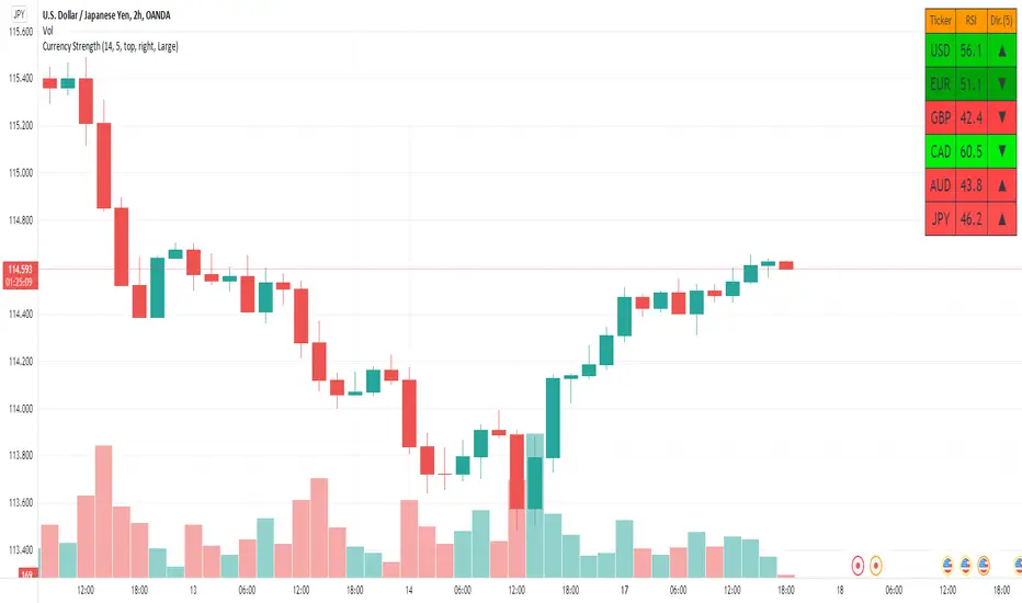 Simply, it averages the RSI values of a currency vs the 5 other currencies in the basket, and displays each average RSI value in a table with color coding to quickly identify the strongest and weakest currencies over the past 14 bars (or user defined length).