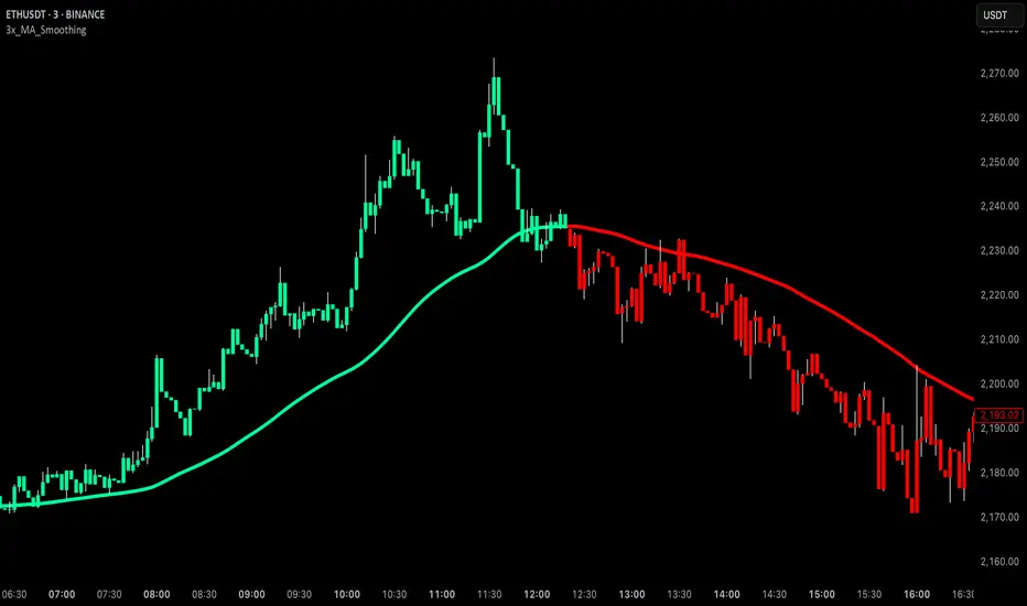 Additionally, the new version colors the final smoothed line based on its slope. If the current value is higher than the previous bar, it plots the line in green; otherwise, it plots it in red. This helps you visually identify whether the final moving average is rising or falling at each bar.