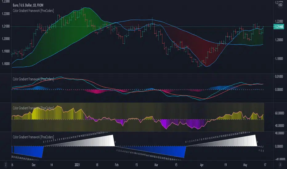 This indicator shows how you can use the new color functions in Pine to generate color gradients. We provide functions that will help Pine coders generate gradients for multiple use cases using base colors for bull and bear states.