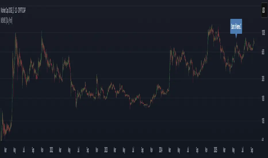 For this indicator, the meme coin market cap of the top meme coins are added together to get an estimate of the total meme coin market cap back to the first meme coin, DOGE. Meme.C does this natively on TradingView, but its data only goes back to 19 May 2025. For the indicator, MEME.C supersedes the addition of all the individual meme coins (i.e., from 19 May 2025 to present). The start of MEME.C is labeled on the chart by default, but can be removed by deselecting the label in the settings.