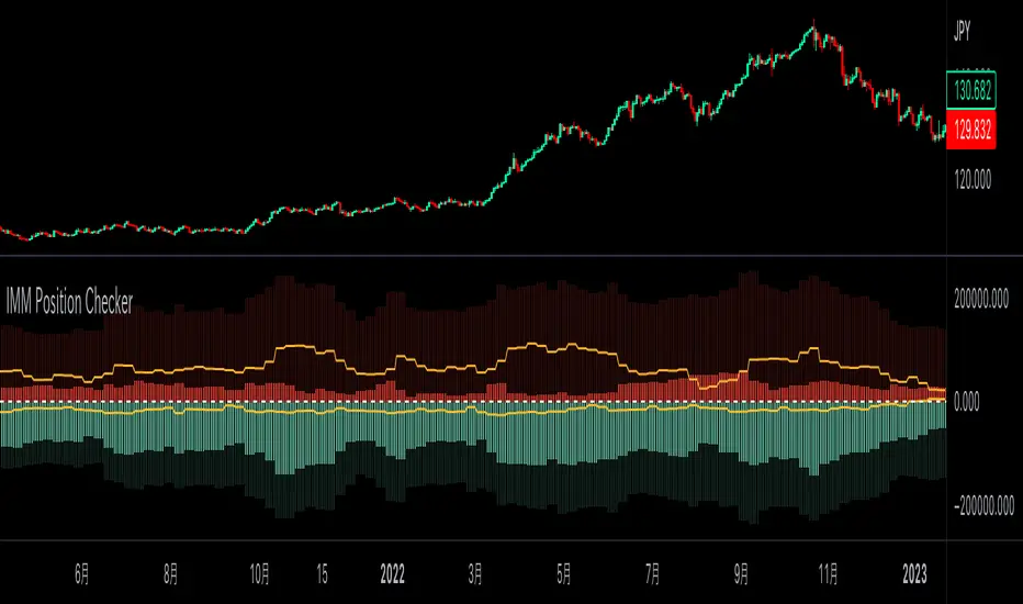Commodity Futures Trading Commission (CFTC)からシカゴIMM通貨先物ポジションのデータを自動インポートし、チャート上に表示するインジケータです。