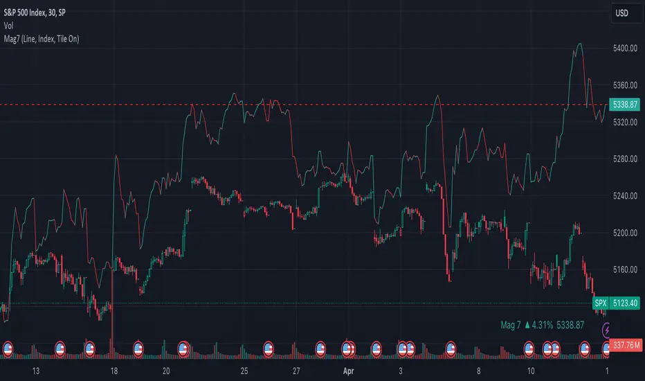 This is an indicator index based on cumulative market value of the Magnificent 7 (AAPL, MSFT, NVDA, TSLA, META, AMZN, GOOG). Such an indicator for the famous Mag 7, against which your main security can be benchmarked, was missing from the TradingView user library.
