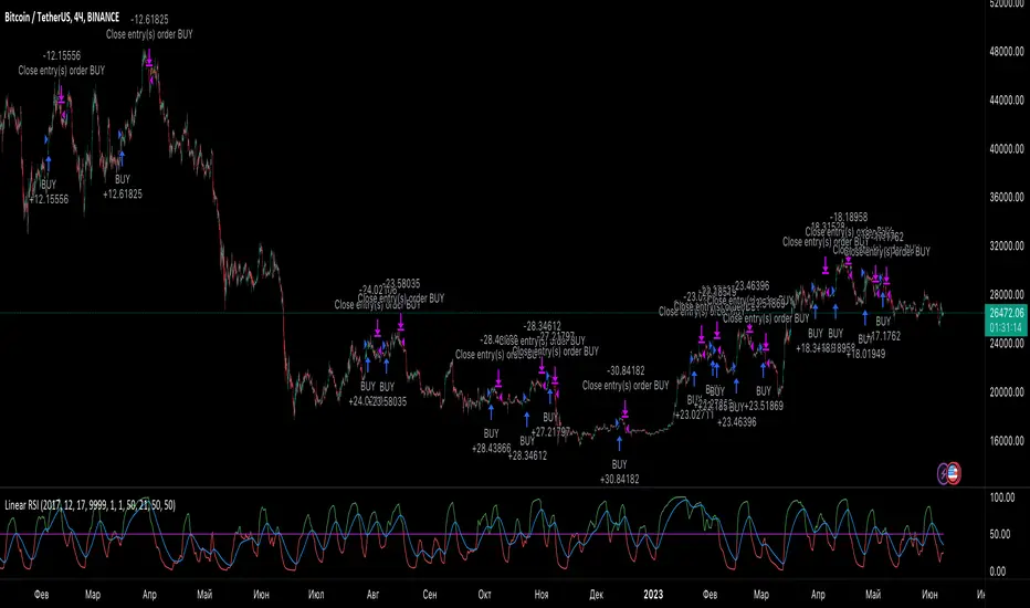 This is an attempt to create a strategy based on the previous post. The strategy, as before, is based on the RSI, which is calculated using linear regression, but with the addition of EMA. The crossing of EMA and RSI is a buy and sell signal. There are also two functions to buy (because I haven't decided which is really better), so please use checkbox to order which one you would like to use.