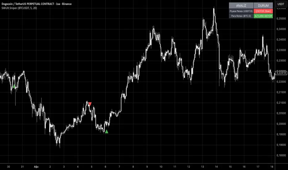 Buy Signal (Green Triangle): Look for a Green Triangle below the bar. Ideally, confirm this with the Dashboard showing "Money Flow: Entering" (Green) and "Trend: Flowing to Alts" (Green).
