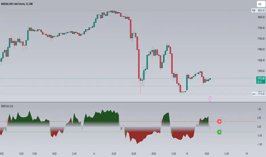 DMO Line: The primary line on the indicator plot. It reflects momentum in relation to the dynamic price range. Positive values indicate bullish momentum, while negative values indicate bearish momentum.